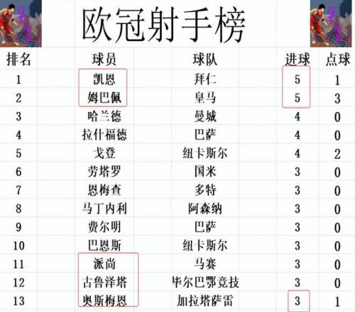 射手榜方面,姆巴佩今天错失良机没有进球,被打入1球的凯恩追上,两人5球并列榜首。哈兰德,拉什福德和戈登4球并列第3。古鲁泽塔,奥斯梅恩,派尚破门,追上劳塔罗,费尔明等人3球刚好挤入前十。